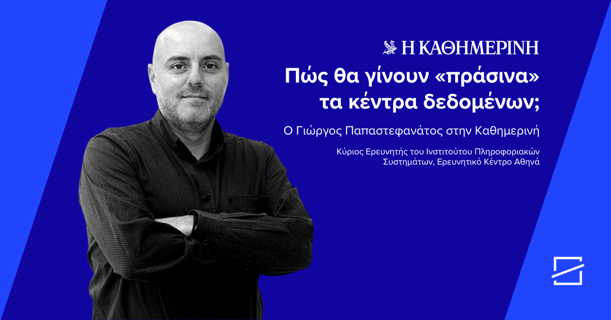 Ο Δρ. Γιώργος Παπαστεφανάτος, Κύριος Ερευνητής του Ινστιτούτου Πληροφοριακών Συστημάτων του Ερευνητικού Κέντρου Αθηνά, μίλησε στην Καθημερινή και στον δημοσιογράφο Γιάννη Ελαφρό, για το ολοένα και αυξανόμενο ενεργειακό ζήτημα που δημιουργείται από τη λειτουργία των Data Centers λόγω της ραγδαίας ανάπτυξης νέων εφαρμογών της τεχνητής νοημοσύνης, του Διαδικτύου των πραγμάτων και της επιστήμης των δεδομένων σε ολοένα και περισσότερους τομείς.